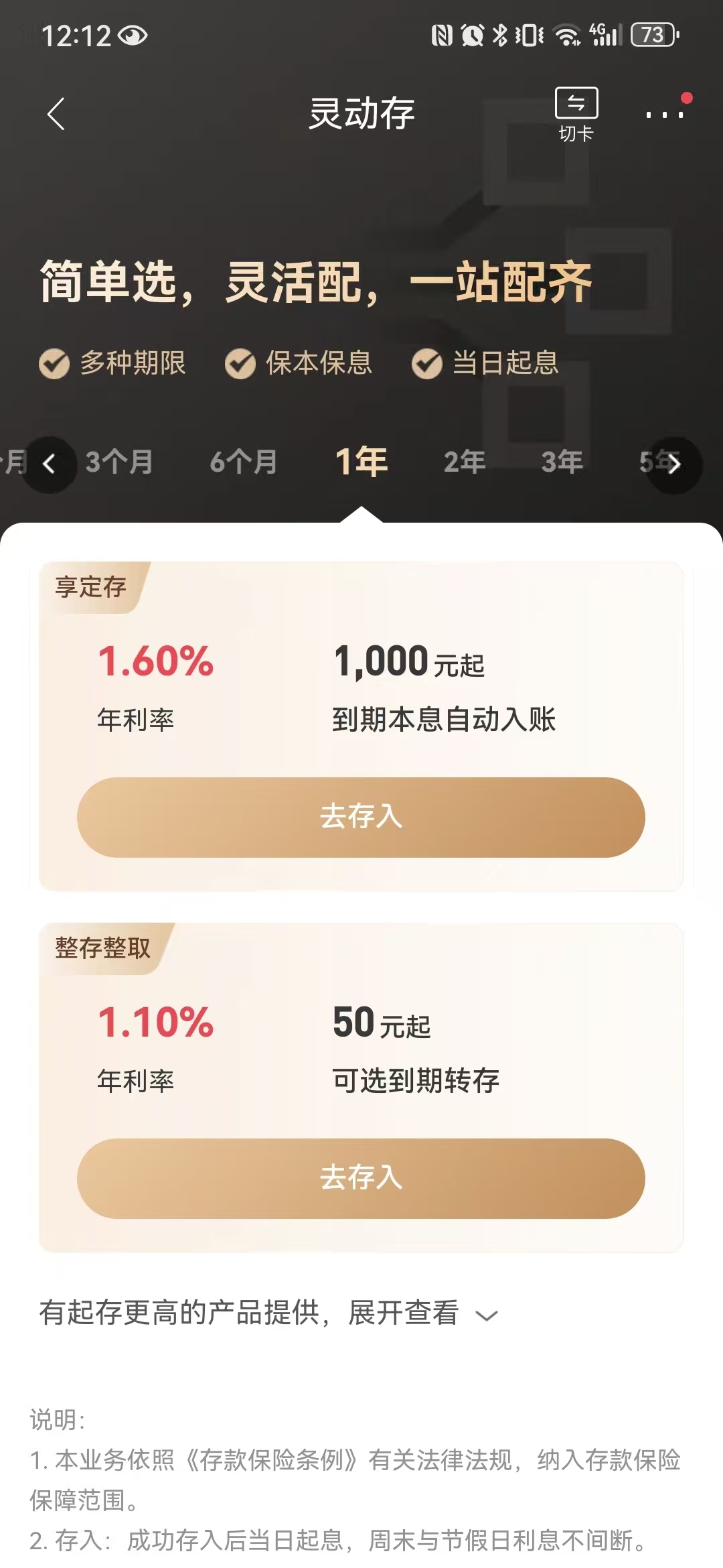 需要指出的,招商银行“灵动存”一年期产品包括“享定存”和“整存整取”两种类型,前者年利率为1.60%,1000元起;后者年利率为1.10%,50元起存;而“灵动存”5年期产品仅显示“整存整取”一种方式,年利率1.55%。